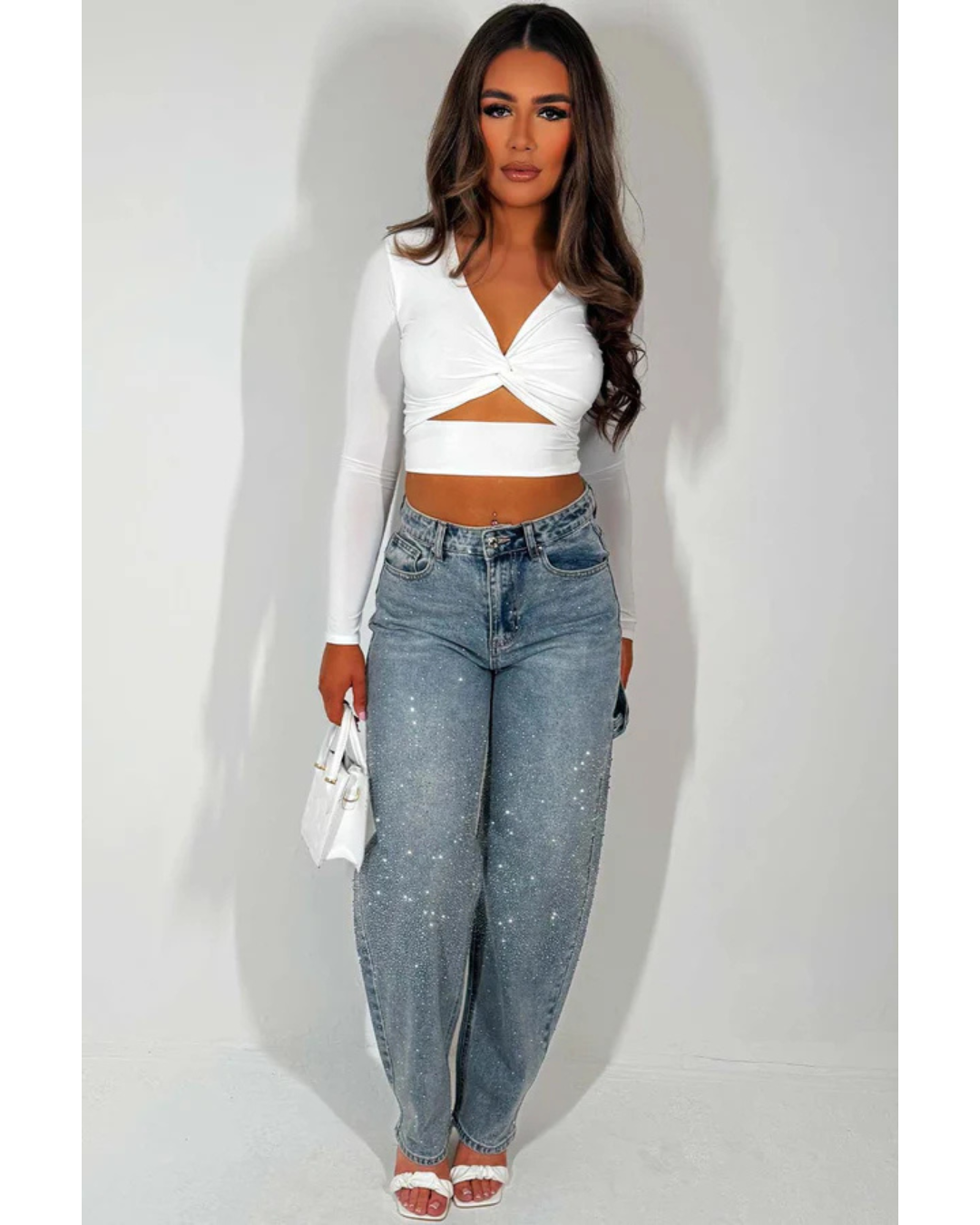 Blugi Largi cu Detalii de Diamante și Stil Cargo