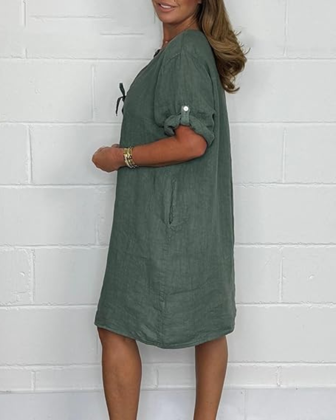 Eleganță naturală în fiecare detaliu. Confecționată din in proaspăt și respirabil, această rochie combină rafinamentul și confortul. Nasturii din față îi conferă un plus de rafinament și versatilitate.
