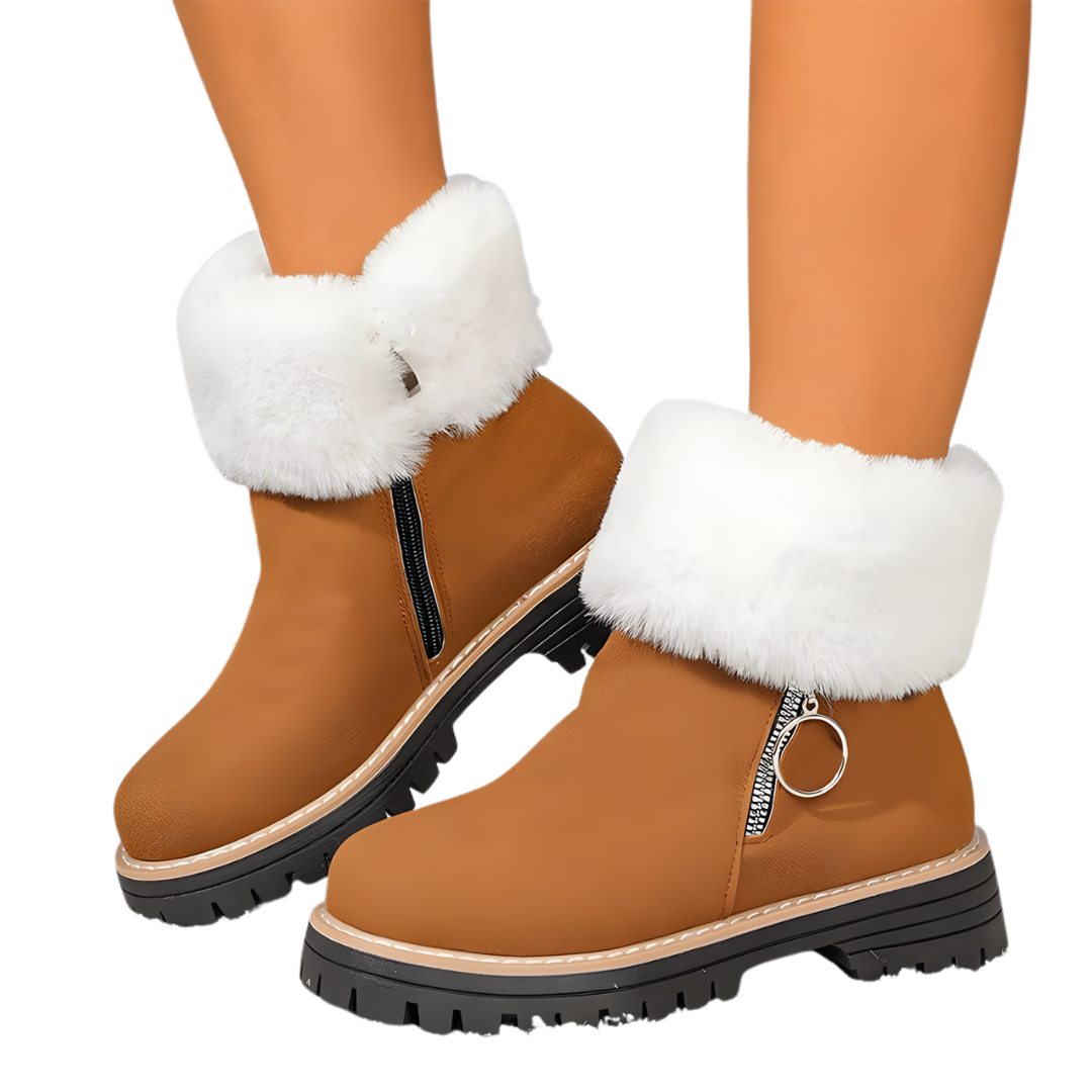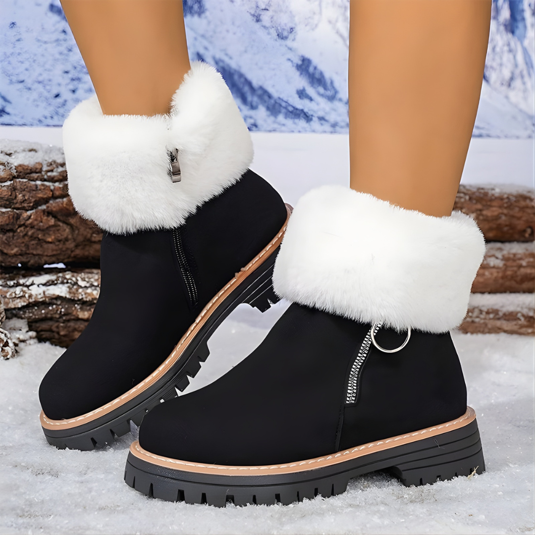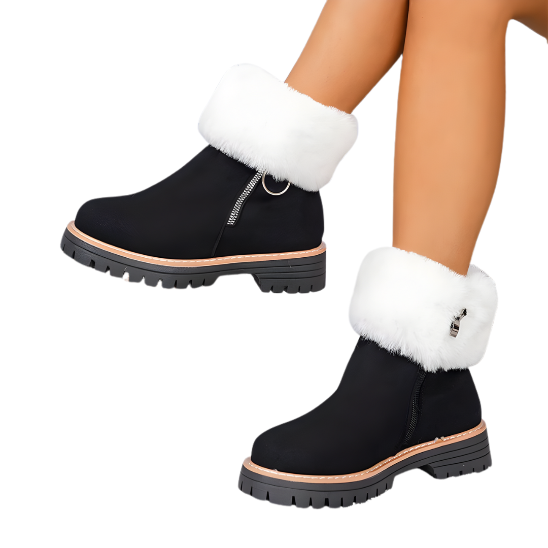 Încorporează o margine de finisare din blană sintetică care nu doar adaugă o notă de lux și farmec de iarnă designului, ci oferă și un strat suplimentar de izolație termică în jurul gleznei. Acest detaliu îți îmbunătățește stilul și te menține excepțional de călduroasă în climatul rece.
