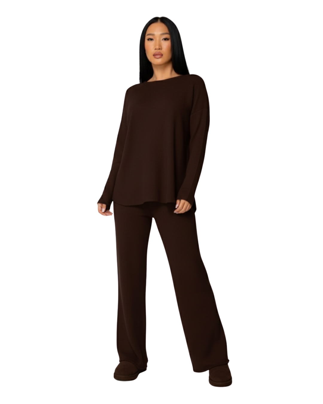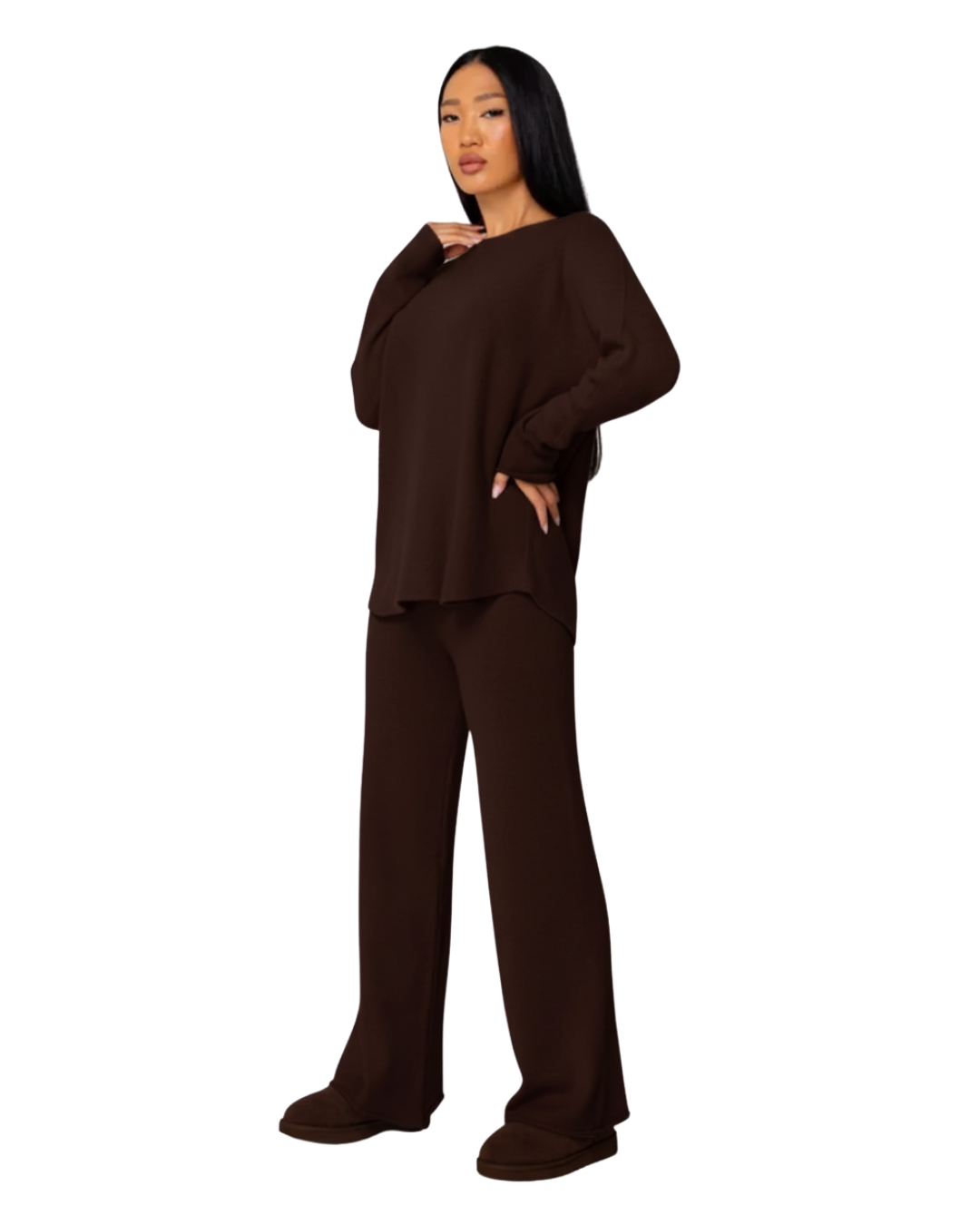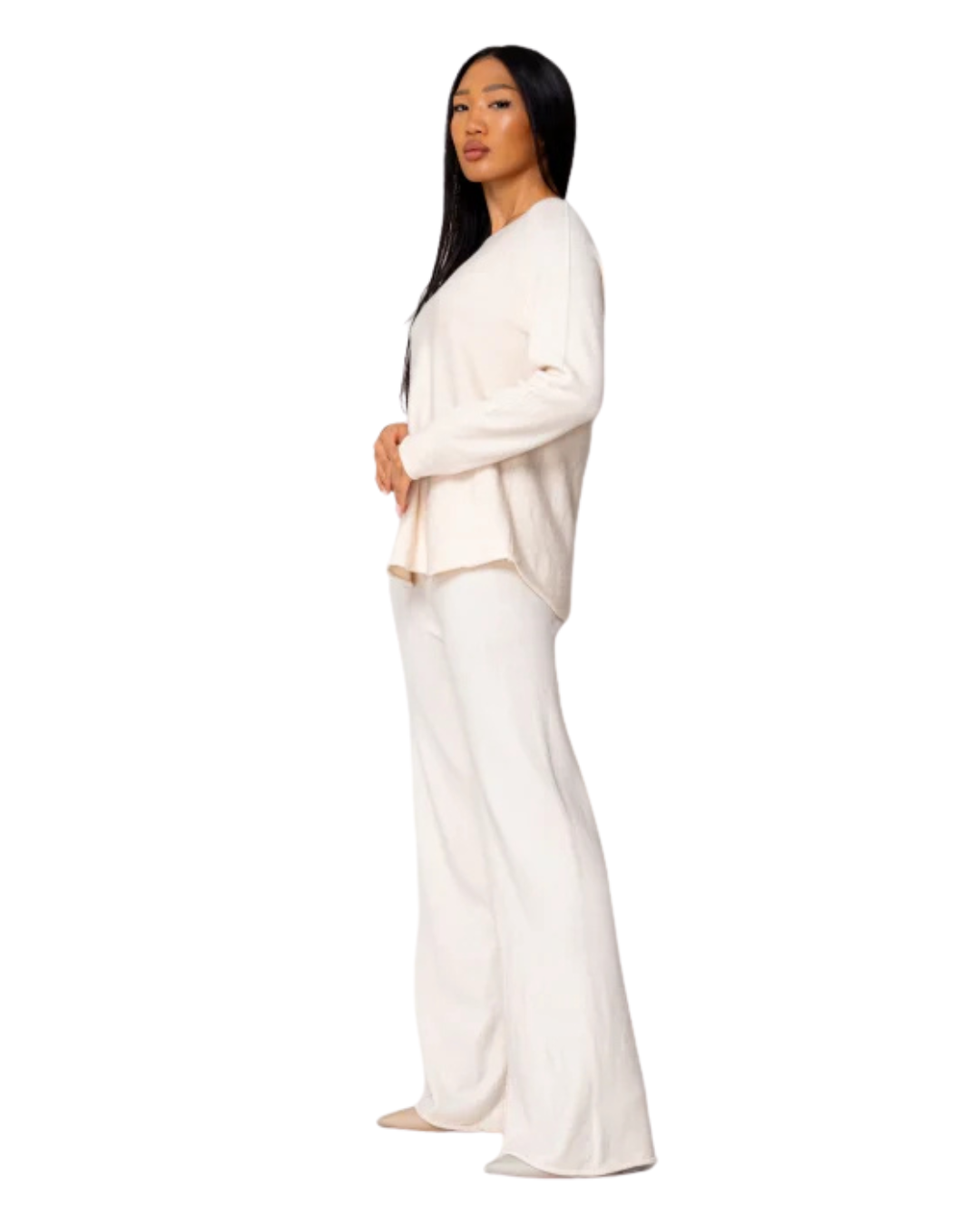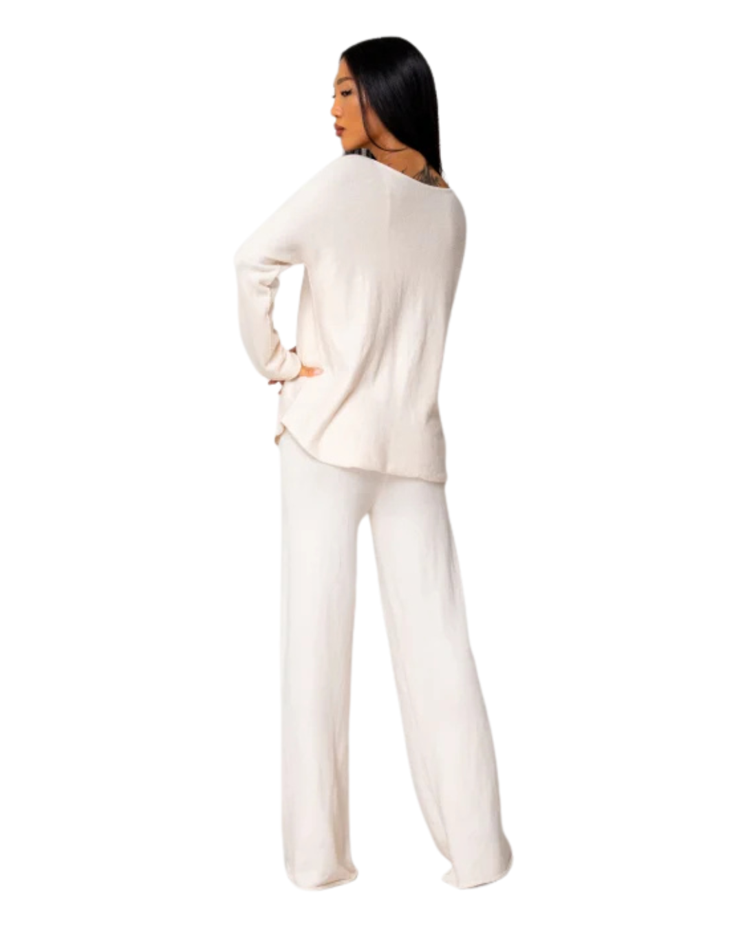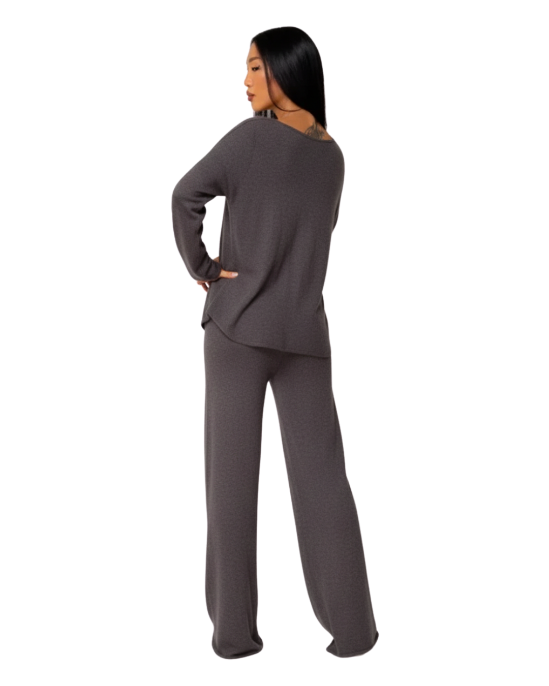 Partea superioară are o croială lejeră și elegantă, care se adaptează natural corpului, creând o siluetă echilibrată. Pantalonii cu picior larg completează ansamblul cu o mișcare fluidă și stilizată. Rezultatul este un look confortabil și armonios, care se remarcă prin simplitate.